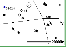 Scale of 4,000 Ft or Less: If you zoom in to a scale of 4,000 Ft or less you will now see the well spot symbols. You can make inactive points active by clicking the "Get Offset wells" button located to the left of the map under tools.